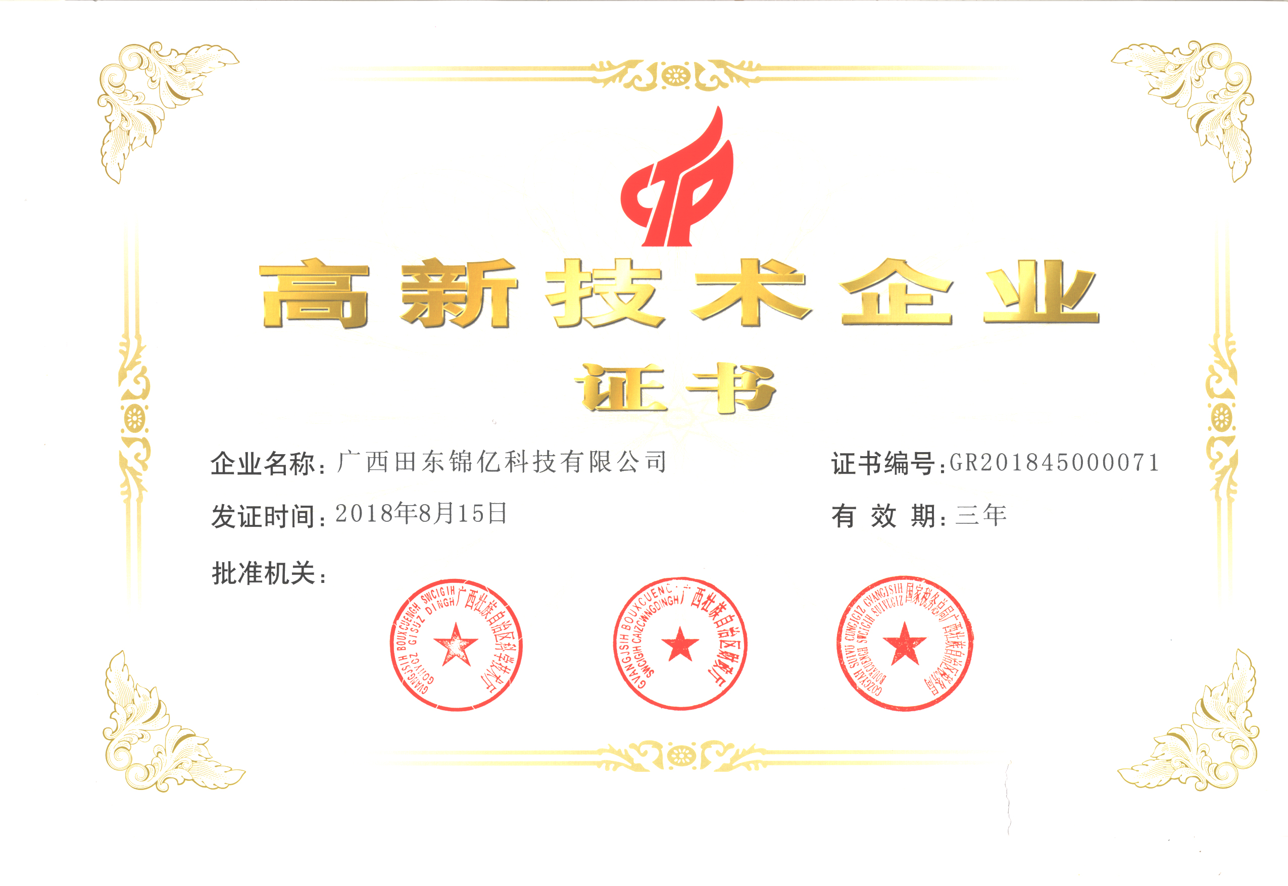 廣西錦億-高新技術企業證書